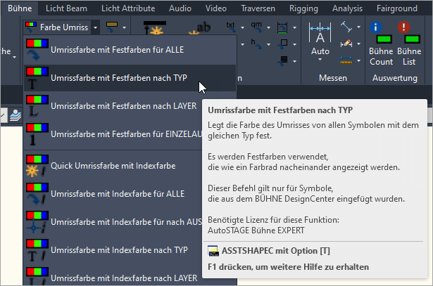 Es werden die Umrisse von allen sichtbaren und nicht gesperrten Bühnen Symbolen in der Zeichnung geändert. Dabei wird das Farbrad bei jeder Befehlsausführung um eine Farbe weiter gedreht.