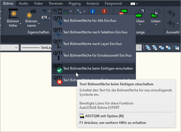 Die Anzeige der Größe der Bühne kann mit dem Befehl ASSTQM ein- und ausgeschaltet werden.