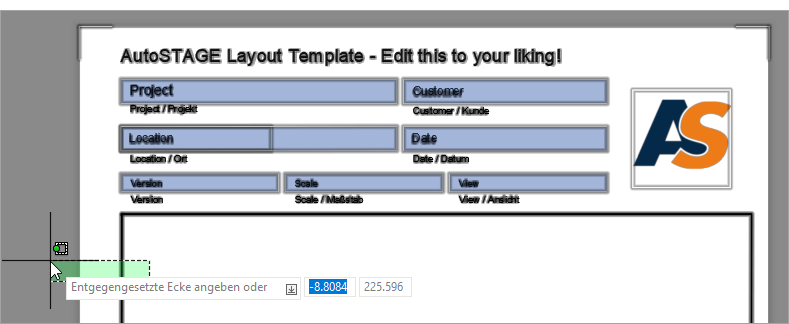 Wenn eine andere Design-Vorlage im Layout verwendet werden soll, dann muss der Anwender den vorhanden Zeichnungsrahmen und das Ansichtsfenster im Layout manuell (per Hand) löschen.